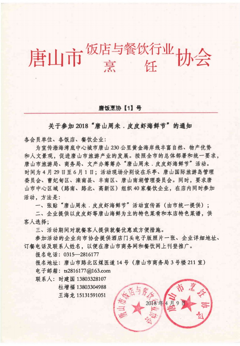 关于参加2018“唐山周末·皮皮虾海鲜节”的通知