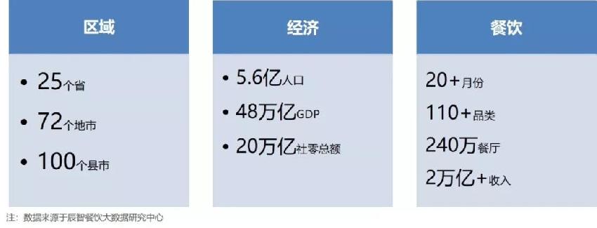 辰智指数涉及中国餐饮行业发展相对领先的25 个 省100个 城市,覆盖5.6亿 人口超过240万 餐厅产生的2万亿 以上餐饮年消费,具体如下: