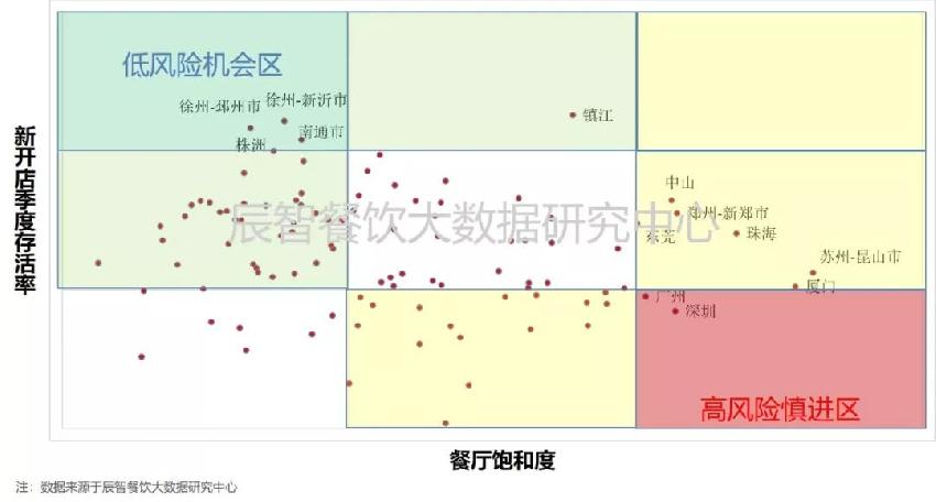 辰智指数餐厅饱和度显示,广东省 多个城市已经进入高风险慎进区,而江苏省 部分地市仍有较大机会!