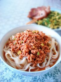 面条煮熟后捞出,浇上炸酱,开动吧。