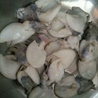 冷冻墨鱼仔泡水解冻,挤掉须中间的小黑点,然后用剪刀剪开眼睛,彻底清洗干净。加盐,料酒和姜片腌制15分钟。