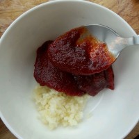调制酱汁。蒜切成蒜蓉,加入两大勺韩式辣椒酱。
