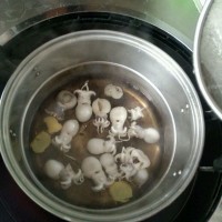 锅里加入料酒,盐和姜片烧开水,下墨鱼仔焯水然后迅速捞出,基本上是一下进去搅一下就捞出来