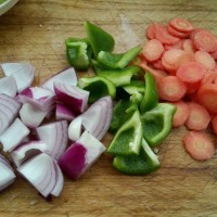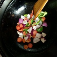 锅里热油,下蔬菜翻炒。