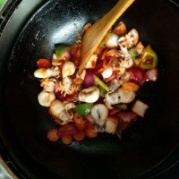 蔬菜炒至快熟,加入调好的酱汁,切件泡菜和墨鱼仔快速翻炒均匀。
