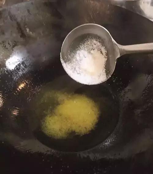 2、锅放底油,下白糖炒成嫩糖色。
