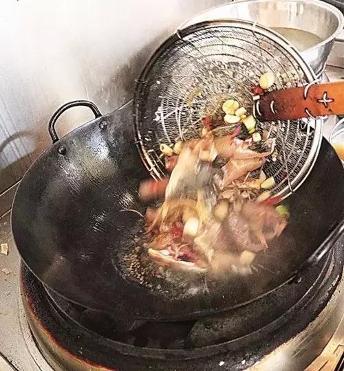 2、糖色炒得略欠一点即需下主辅料,同炒几下后糖色恰到好处,如果等糖色炒好再下料,翻炒后糖色就会变老、口味发苦。