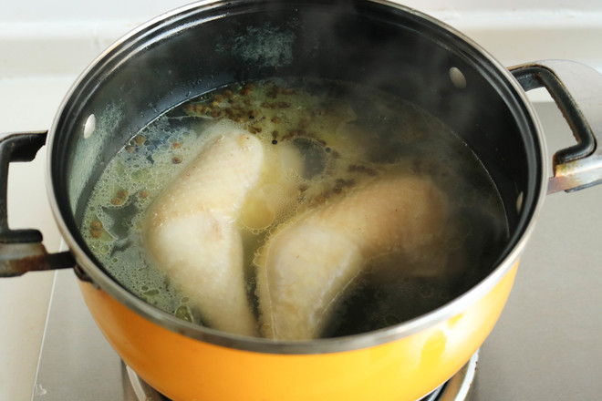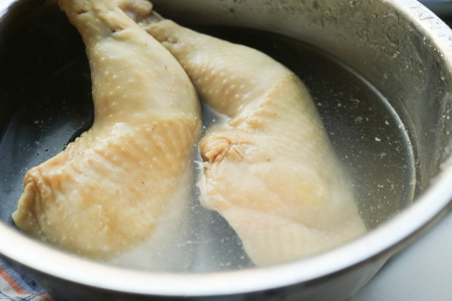汤锅加水,放入葱姜和花椒,放入鸡腿,煮开后煮10分钟关火,盖盖子再焖5分钟。