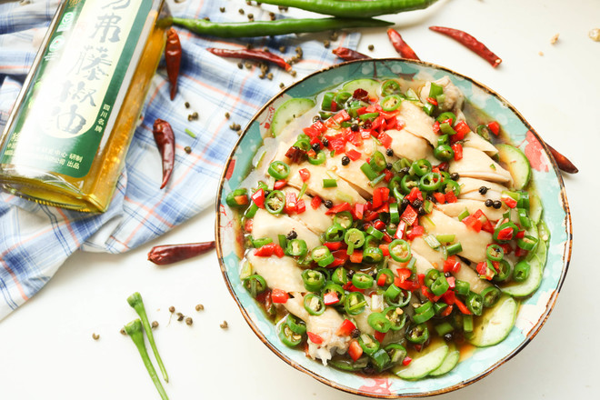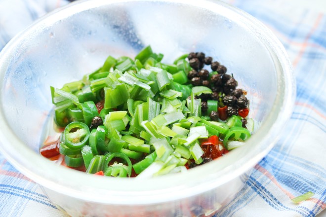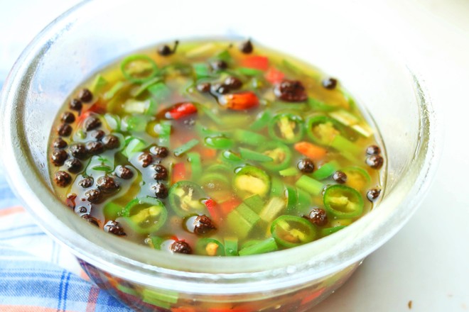 迅速把花椒油倒入刚才准备好的青椒中,会有刺啦的声音,香味也随之散发出来。再拌入蒜泥和生抽调味。料汁就做好了。