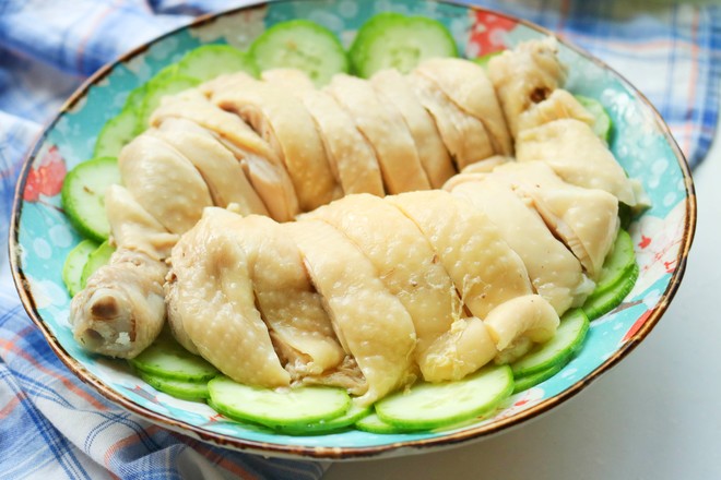 冰好的鸡腿用快刀迅速斩成小段。此处一定是快刀斩乱麻的那种刀法,不然切碎了就不好看了。切好的鸡腿放入盘子,盘子底部提前铺上一圈黄瓜片。
