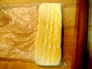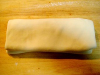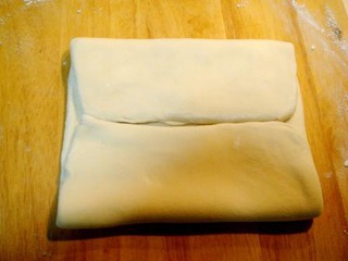 17、 然后用保鲜膜包好,放入冰箱冷藏30分钟。按此法共操作三次,每次都要冷藏30分钟,而最后一次要冷藏60分钟,此为四层三叠法。