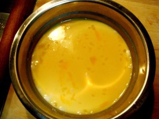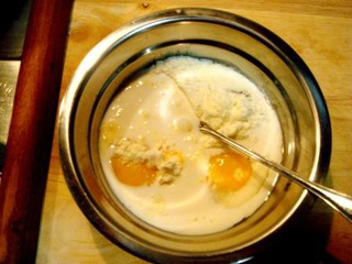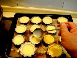 2、挞水里放入炼乳和吉士粉,味道会更加香甜,没有也可不放。还可放20%的淡奶油,味道也不错,最好使用蛋黄,如用全蛋口感稍差些。