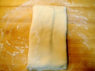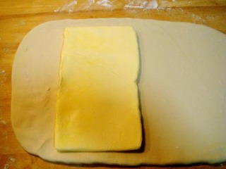 11、 把冷藏松弛好的面团儿取出,用擀面杖擀开,擀成长方形,大小是裹入油的两倍大,然后把裹入油放在面片上面。