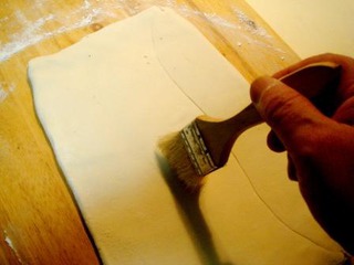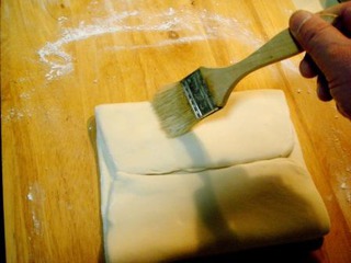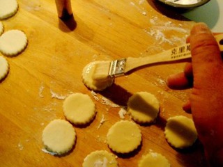 23、 在烘烤蛋挞期间可制作另一款小点,在刻好的面片上用毛刷涂一层清水。