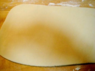 18、 把最后冷藏过的面团儿从冰箱取出,用擀面杖擀开,擀成5毫米厚的面片儿。