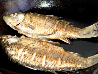 2、铁锅上炉,先将锅烧热,再倒入适量花生油,油热后,将一条鲫鱼放入,两面煎黄后,取出放盘,再将另一放入煎好放盘备用。