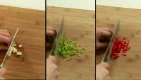1.大明虾去须,然后剖开,将虾尾摆入盘中,蒜子、青椒、红椒依次切碎。