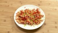 3.锅入清水烧开,将虾放入锅中,盖锅盖,隔水蒸六分钟出锅。然后放入青、红椒碎。